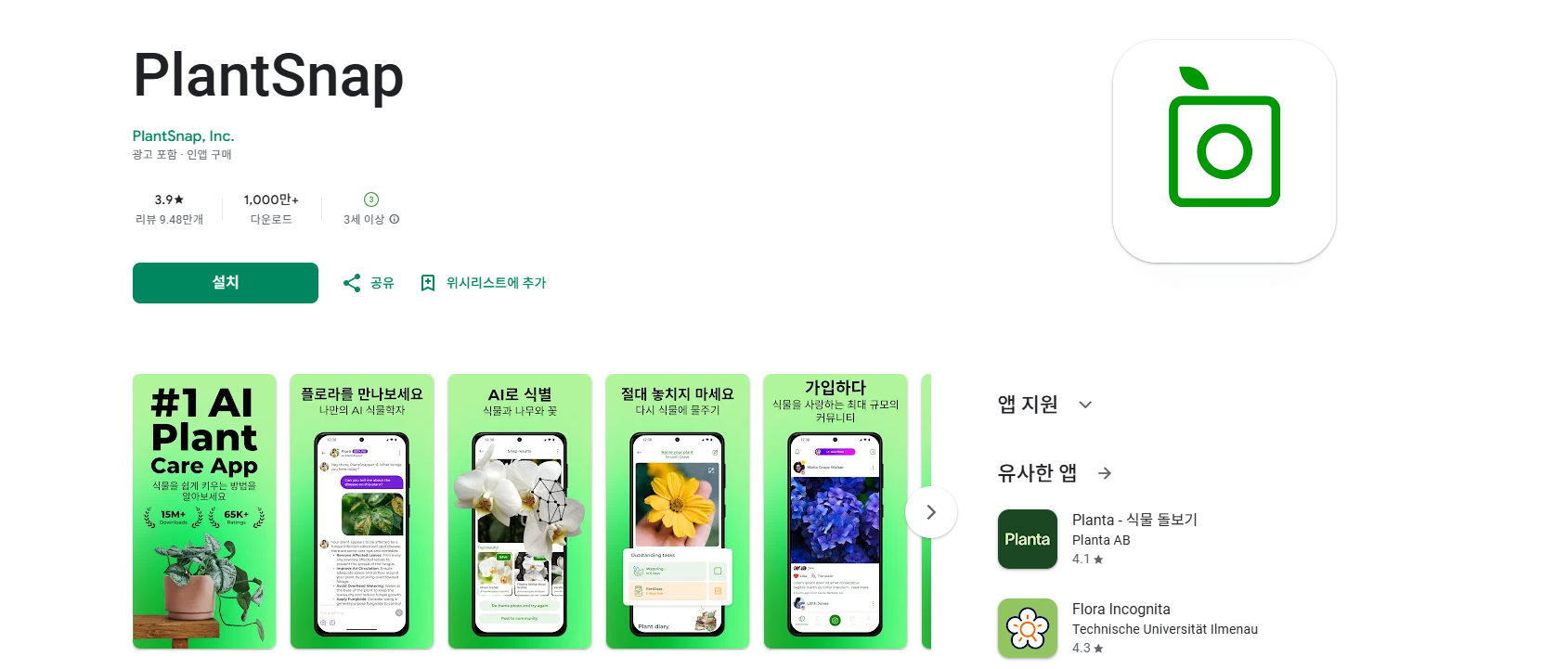 - 전 세계적으로 인기 있는 앱으로, 40만 종 이상의 식물을 98% 이상의 정확도로 식별 가능